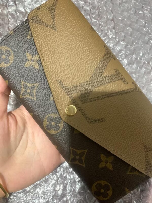 The Sarah wallet is revisited in an elegant combination of Monogram and Monogram Reverse Giant canvas. This classic, rectangular wallet is notable for its well-organized interior featuring an array of pockets and card slots. Its envelope-style flap is secured with an engraved, gold-tone press-stud.