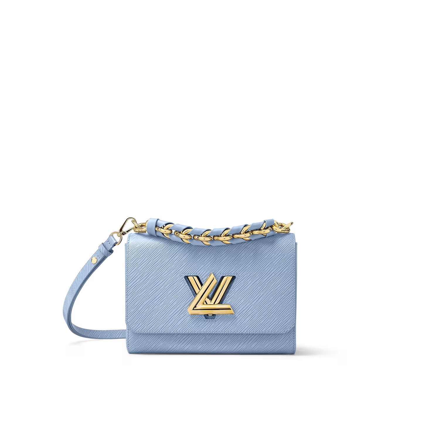 For Spring 2023, Louis Vuitton revisits the essential Twist MM Braided Chain bag, fashioning it in a luminous light-blue Epi grained leather, with a removable chunky chain, braided with leather. Signed with a gold-color LV Twist lock, it has a removable and adjustable shoulder strap, allowing multiple carry options.