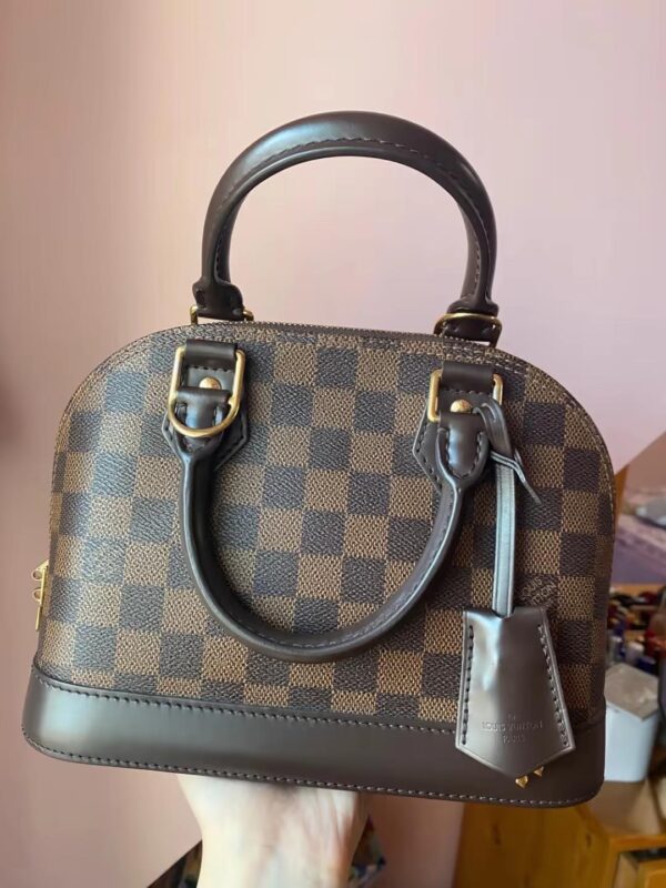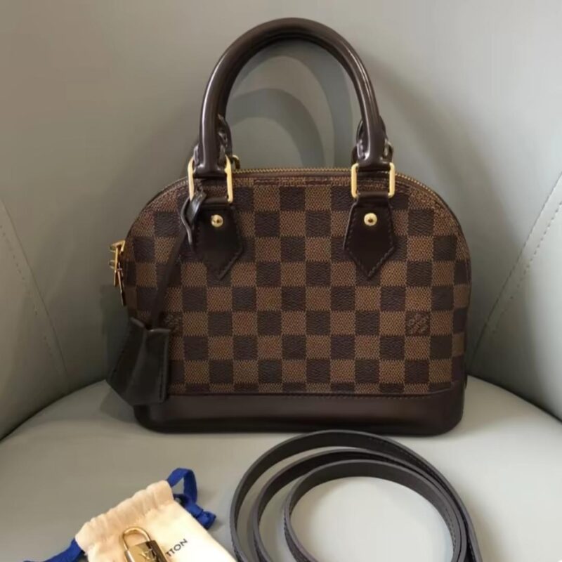 The Alma BB handbag traces its pedigree to the Art Deco original, introduced in 1934. Signature details impart a timeless elegance to this model made from graphic Damier Ebene canvas: note the golden padlock and keys, twin Toron handles and chic leather key bell. Equipped with a removable strap, this charming small bag is perfect for cross-body wear.