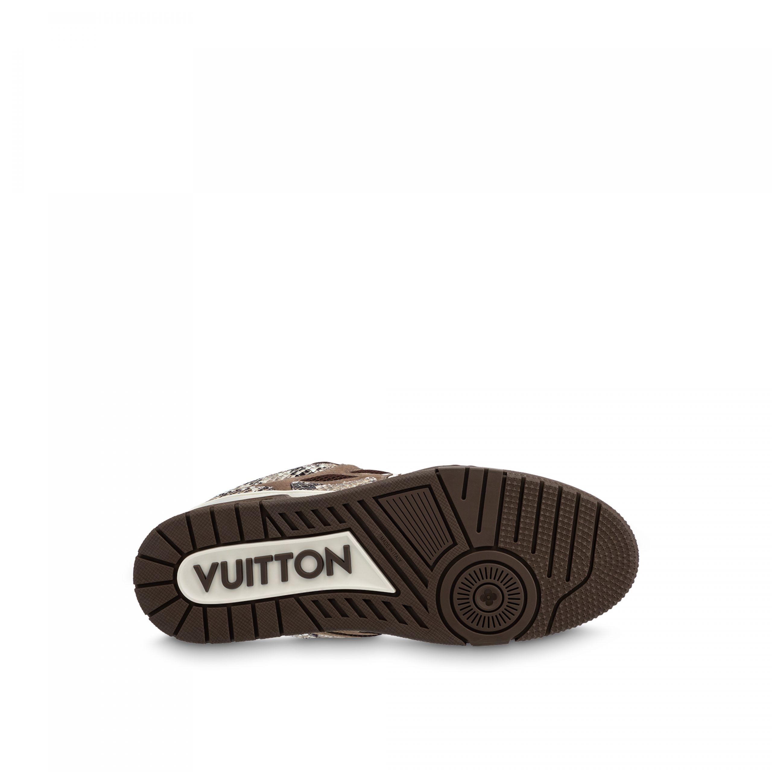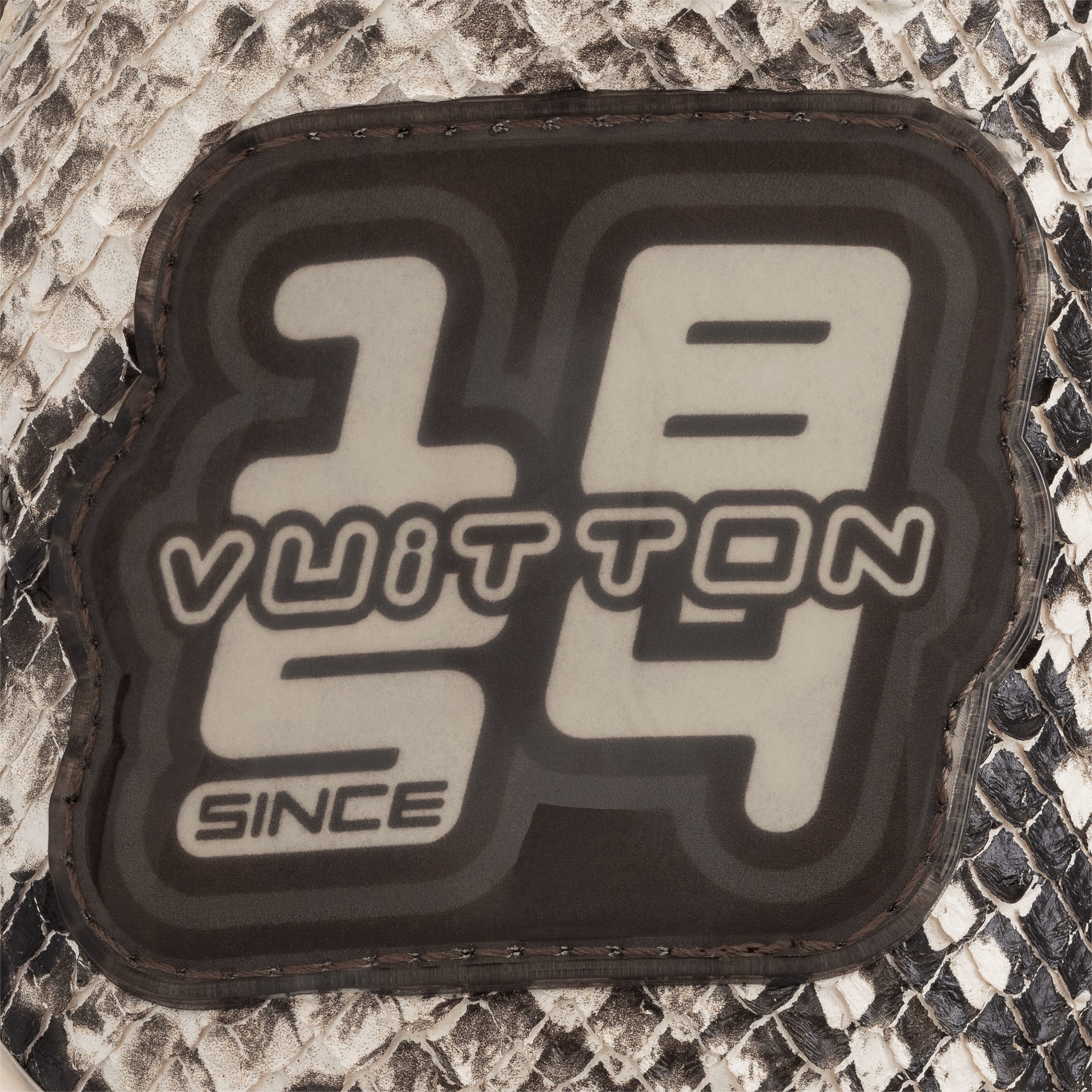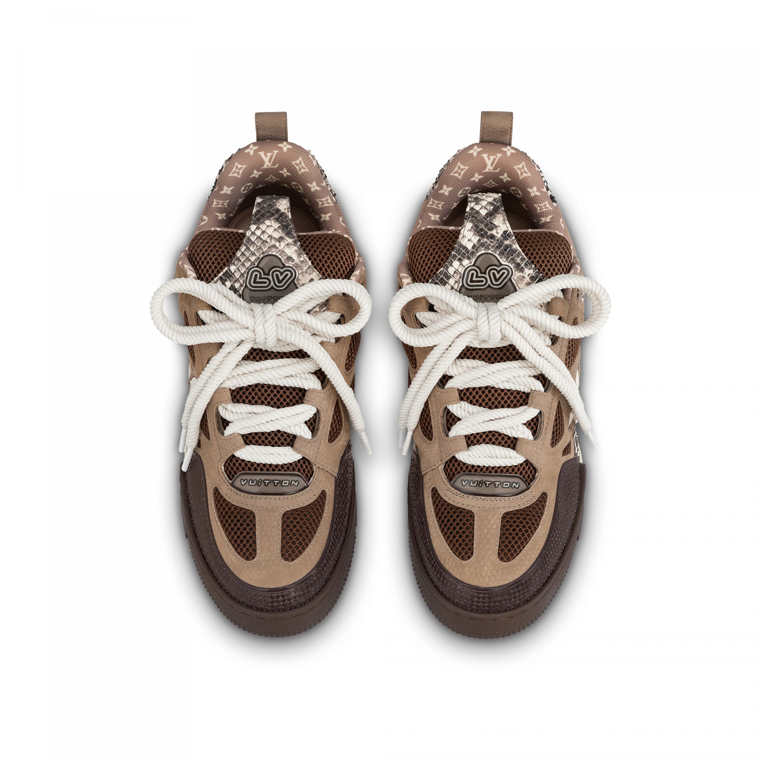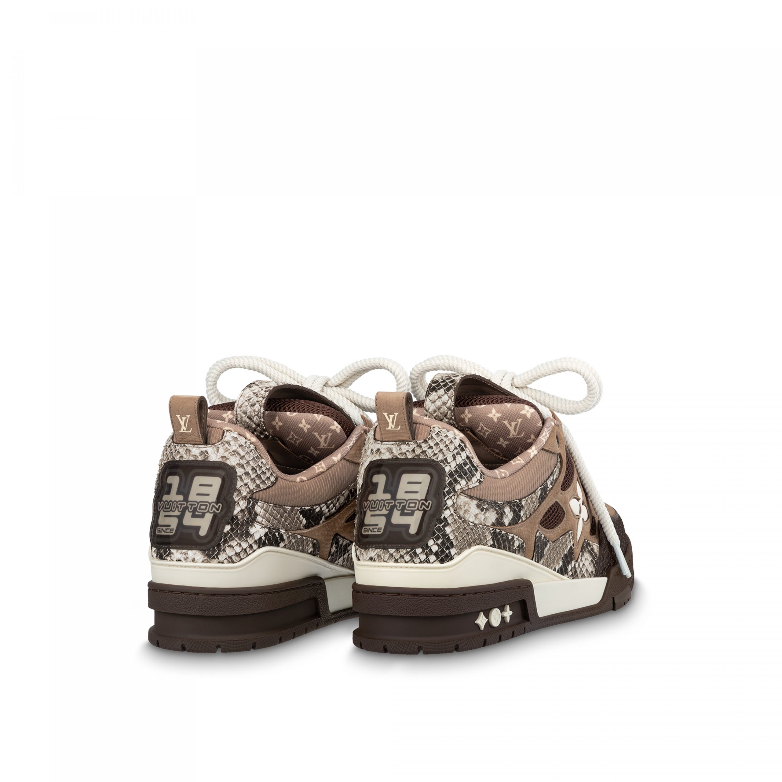 The LV Skate sneaker is a Nineties-inspired design in a mix of materials, including technical mesh and python-styled embossed leather. This model is notable for its padded collar and tongue, as well as its technical lining printed with the Monogram pattern. It is finished with a bicolor rubber outsole decorated with Monogram Flowers.