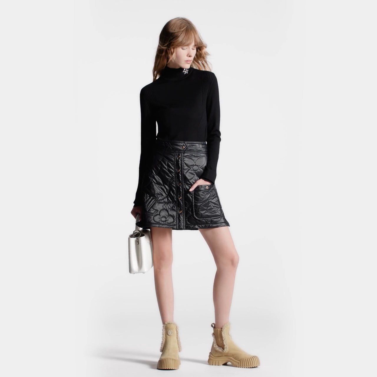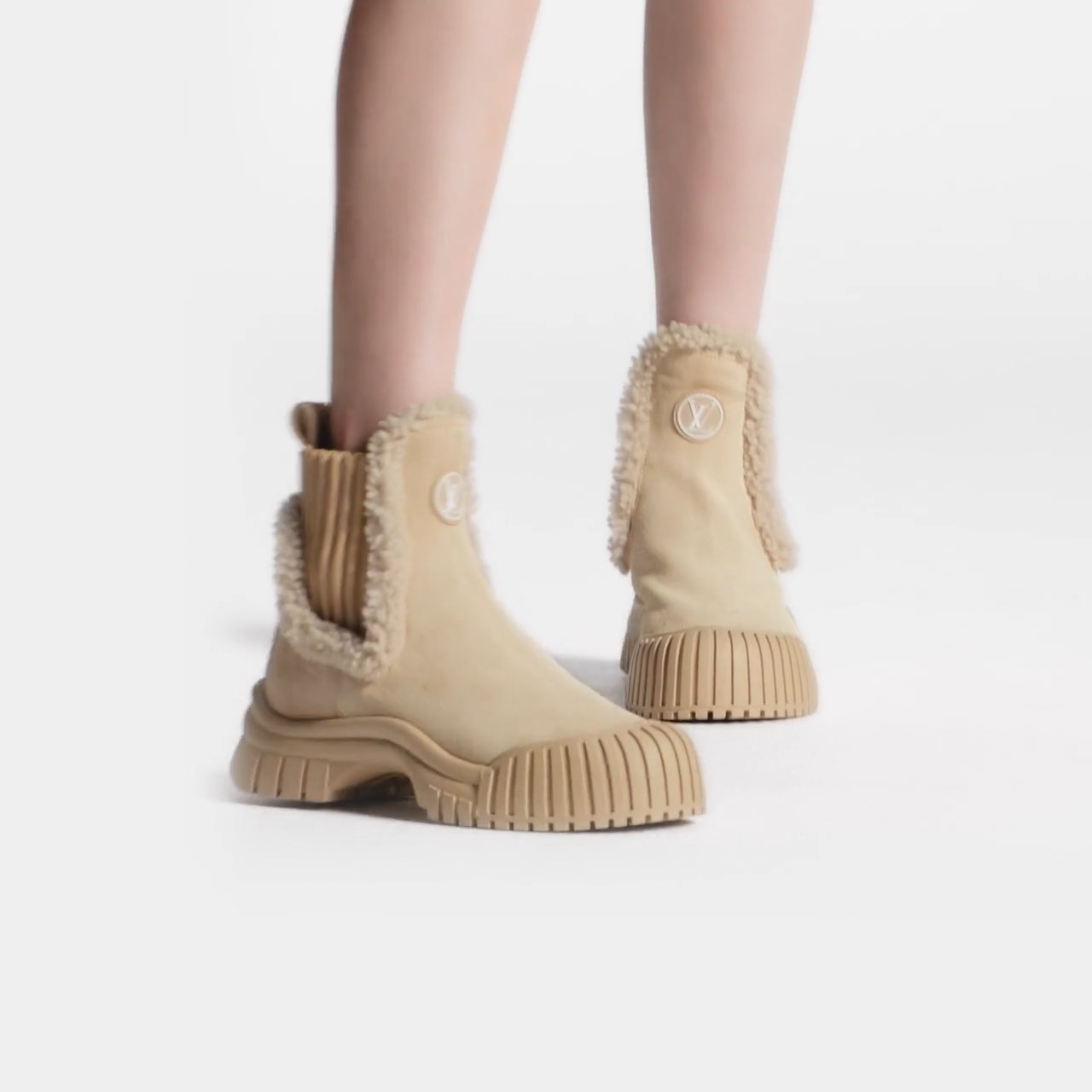This wintry version of the Ruby flat ankle boot comes in suede calf leather with fluffy shearling trim. This model features distinctive elastic side panels inspired by Chelsea boots, while its chunky yet lightweight rubber outsole discreetly adds extra height. It is signed with an LV Circle logo on the front.