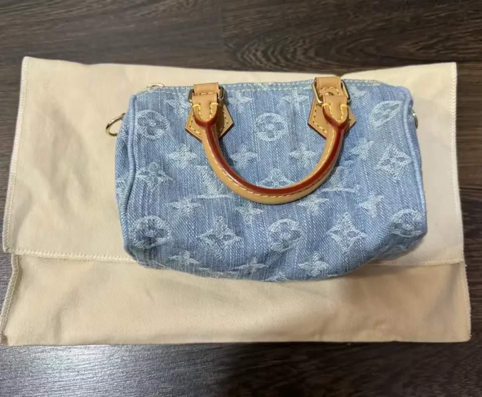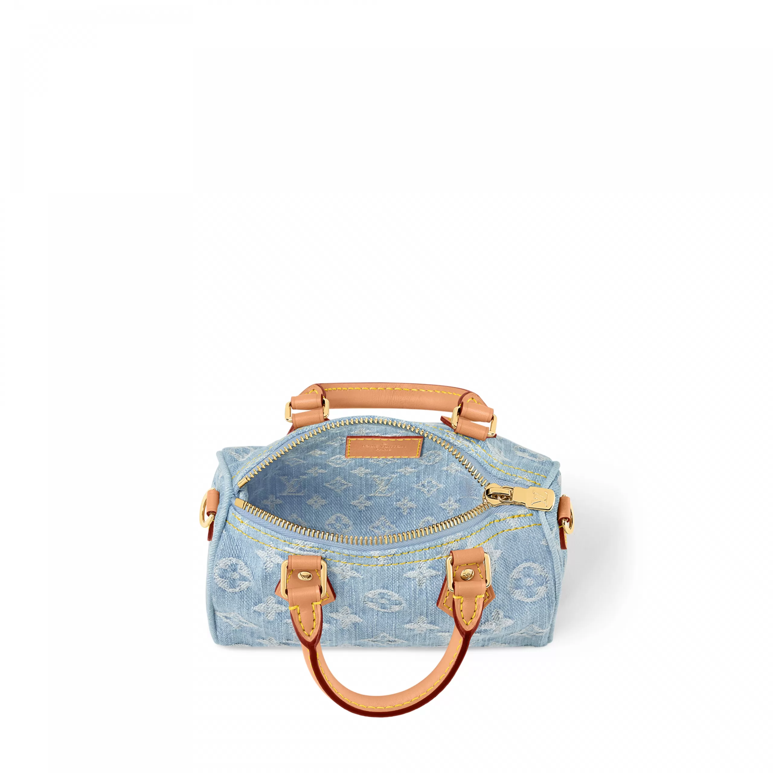 This summery iteration of the Nano Speedy bag comes in pure cotton denim, which is first woven with the Monogram pattern, then bleached and stonewashed to create a fashionable vintage look. The denim is complemented by natural leather with a subtly aged appearance on the bag’s two handles and removable, adjustable shoulder strap.