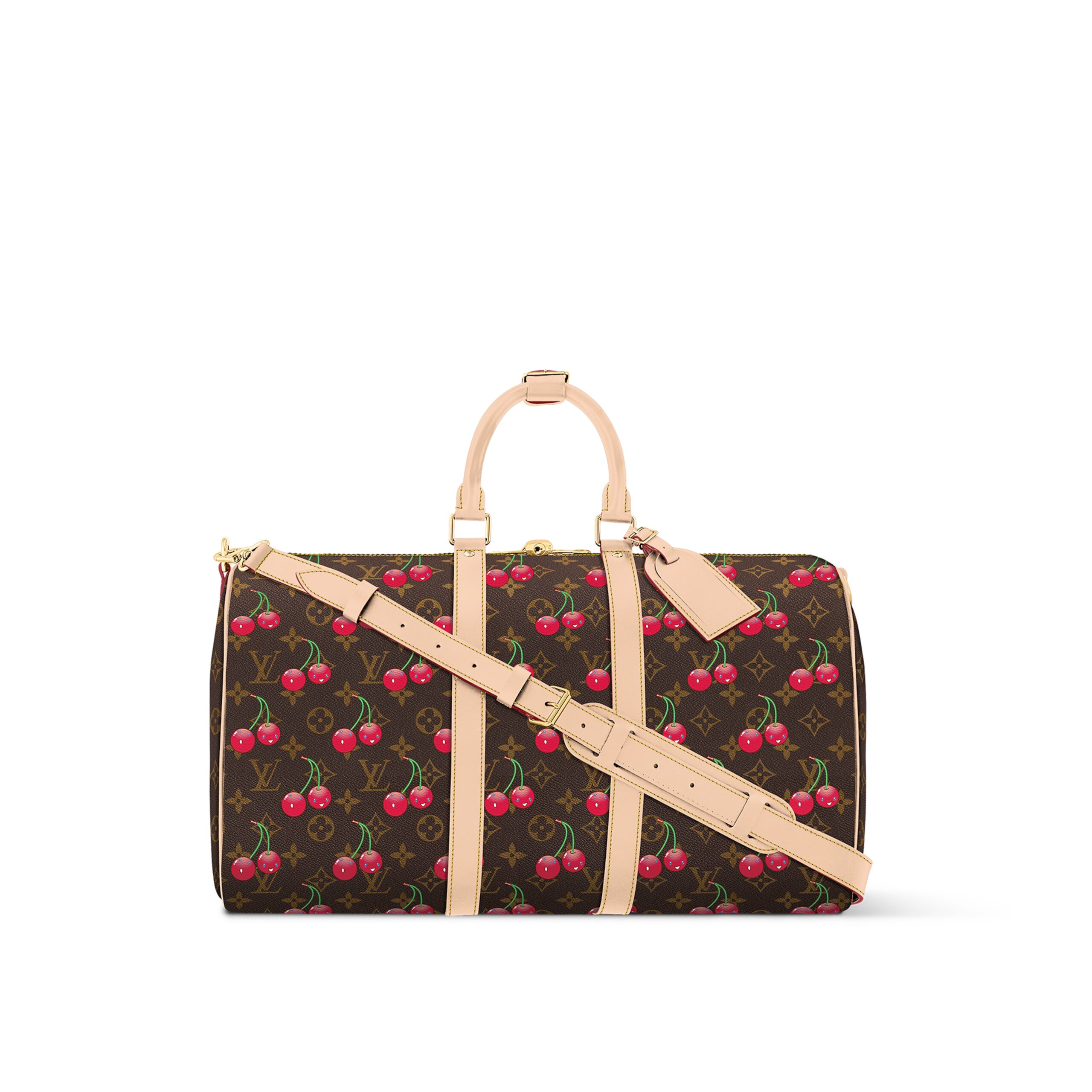 The iconic Keepall Bandoulière 45 is playfully revisited as part of the re-edition of the Louis Vuitton x Takashi Murakami collection. The House’s classic Monogram canvas is scattered with luscious cherry motifs in the renowned Japanese artist’s colorful aesthetic, which is complemented by a bold red lining. The emblematic lateral bands, top handles and adjustable strap are highlighted in elegant natural leather, while golden hardware completes the look.