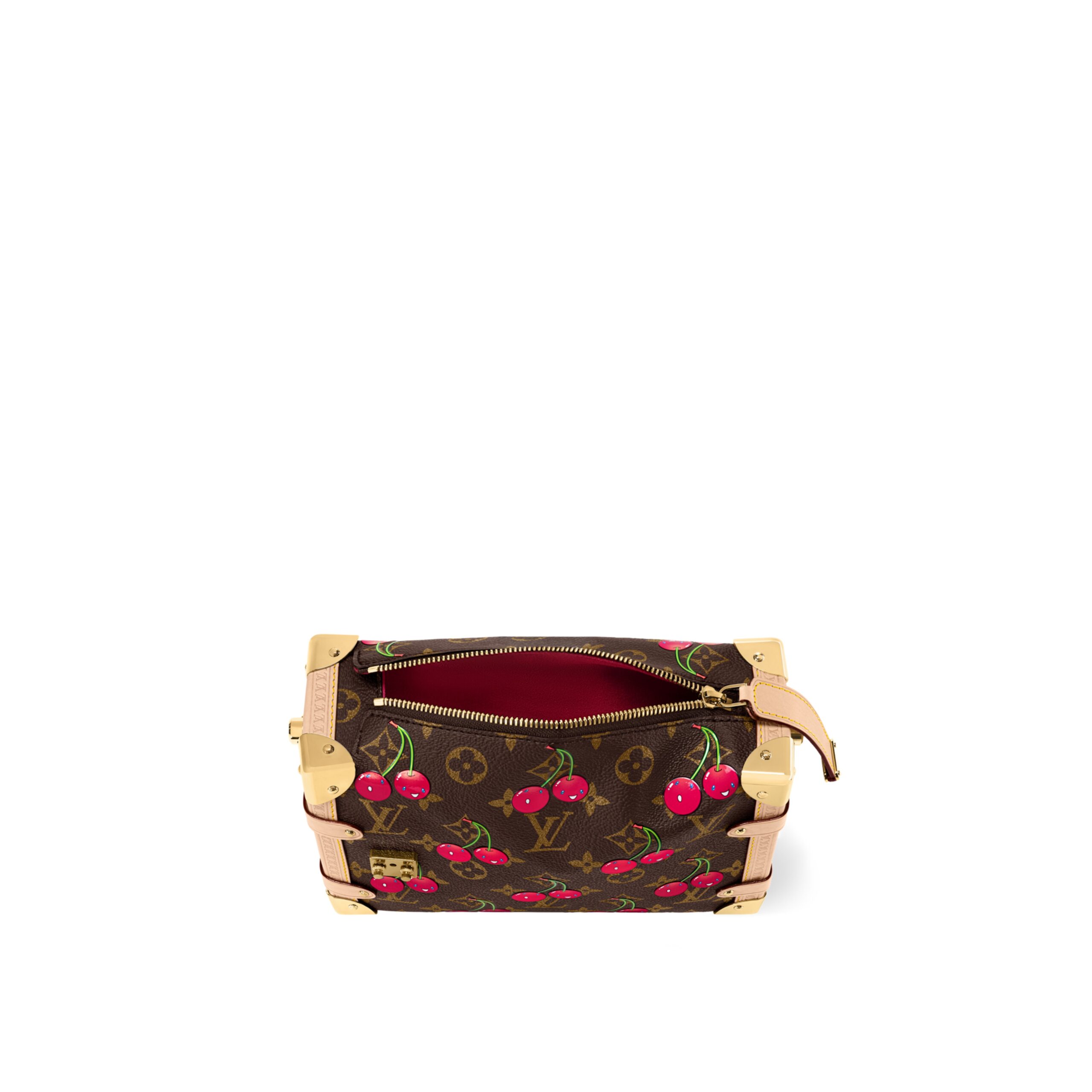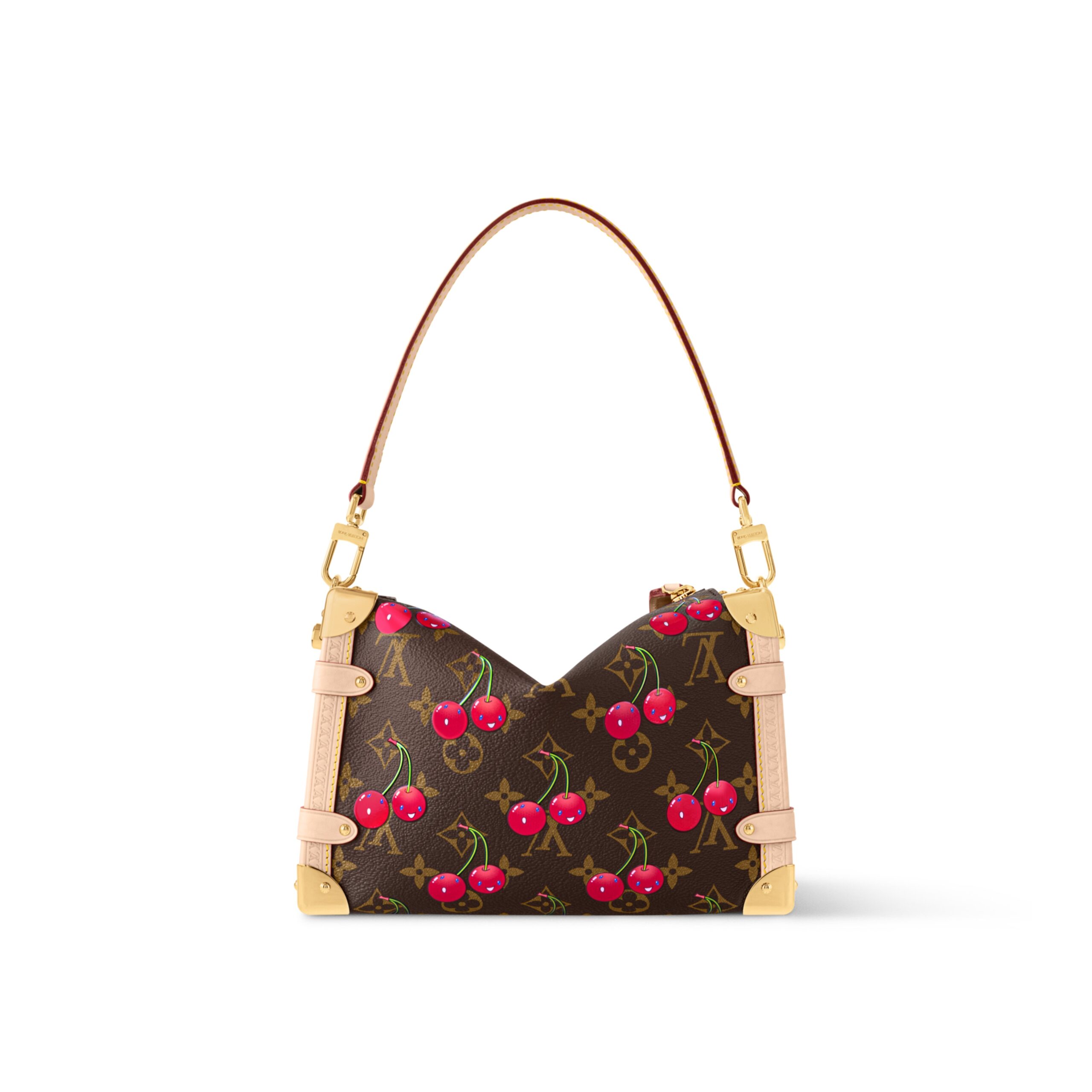 Reflecting the playful spirit of the celebratory re-edition of the Louis Vuitton x Murakami collection, the Side Trunk MM is crafted from classic Monogram coated canvas adorned with luscious cherry motifs in the Japanese artist’s exuberant aesthetic. Natural cowhide leather trims and golden hardware pay homage to the House’s travel heritage, including riveted corners and an S-lock closure.