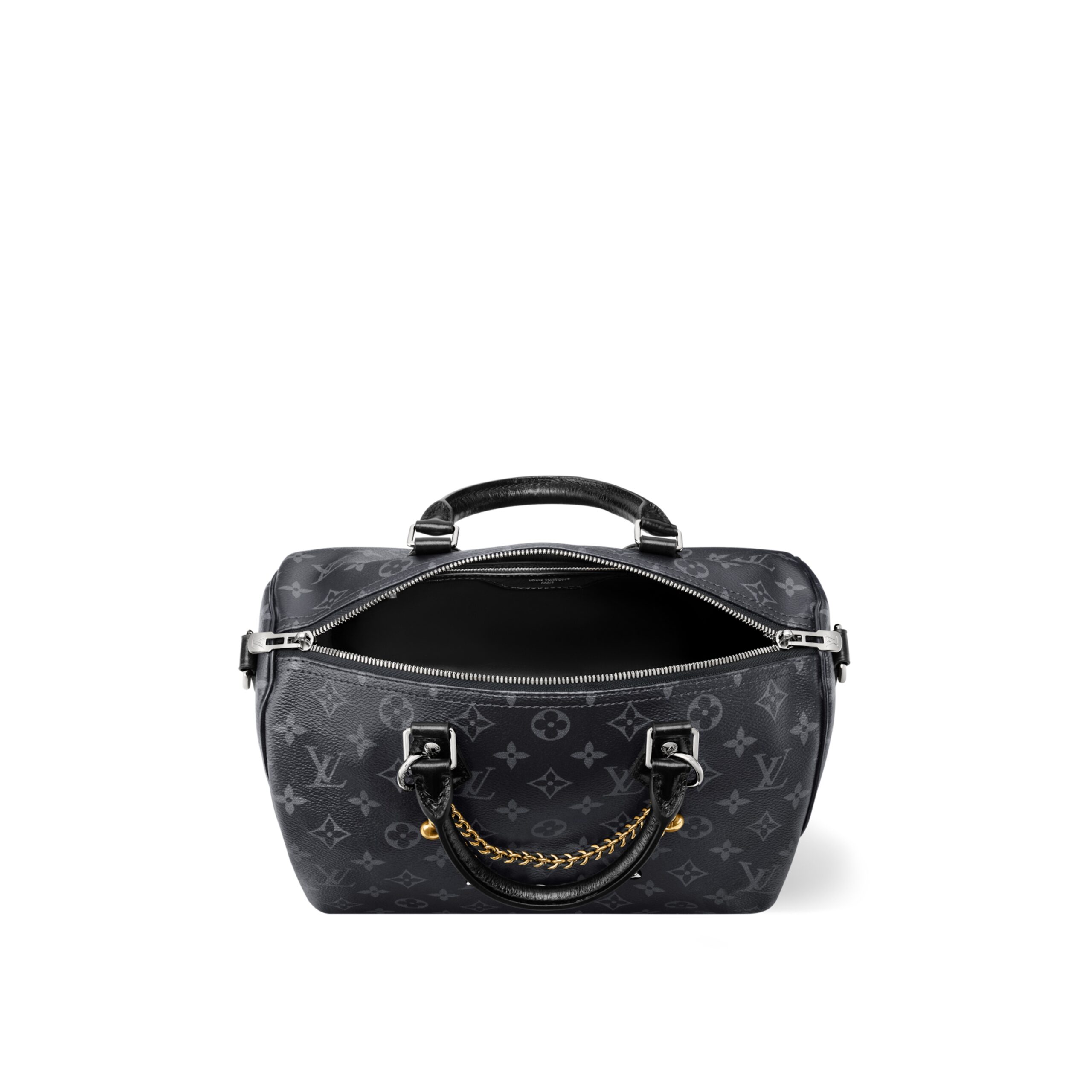 The Speedy Soft 30 is reimagined as part of the LV Ski collection in the House’s signature Monogram Eclipse canvas. The iconic style is adorned with an exclusive double chain and crinkled leather keybell, and also includes a signature padlock. This edition is sized to fit a tablet, as well as other daily essentials.
