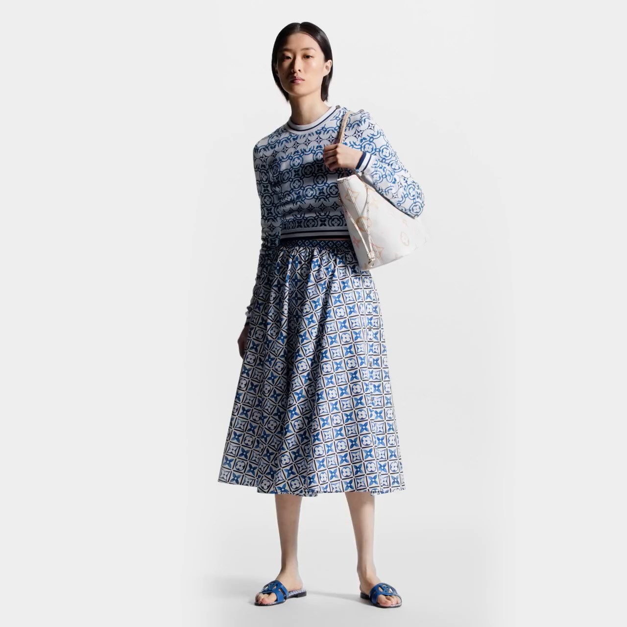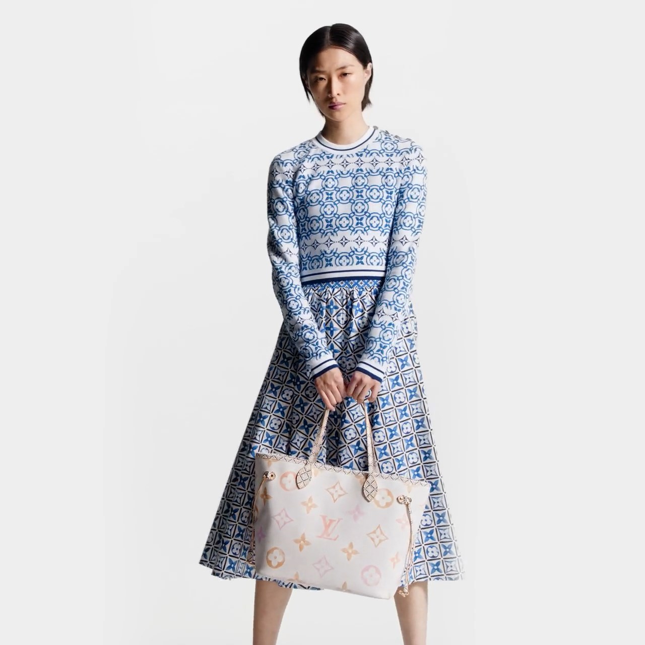 The Neverfull MM tote is summer-ready in cream-color canvas with a Giant Monogram pattern in pastel. The LV’s and Monogram Flowers are rendered irregularly, as if in watercolor, and are perfectly complemented by the dense Monogram Blossom print on the trim along the top of the bag and on the handles and their mounts.