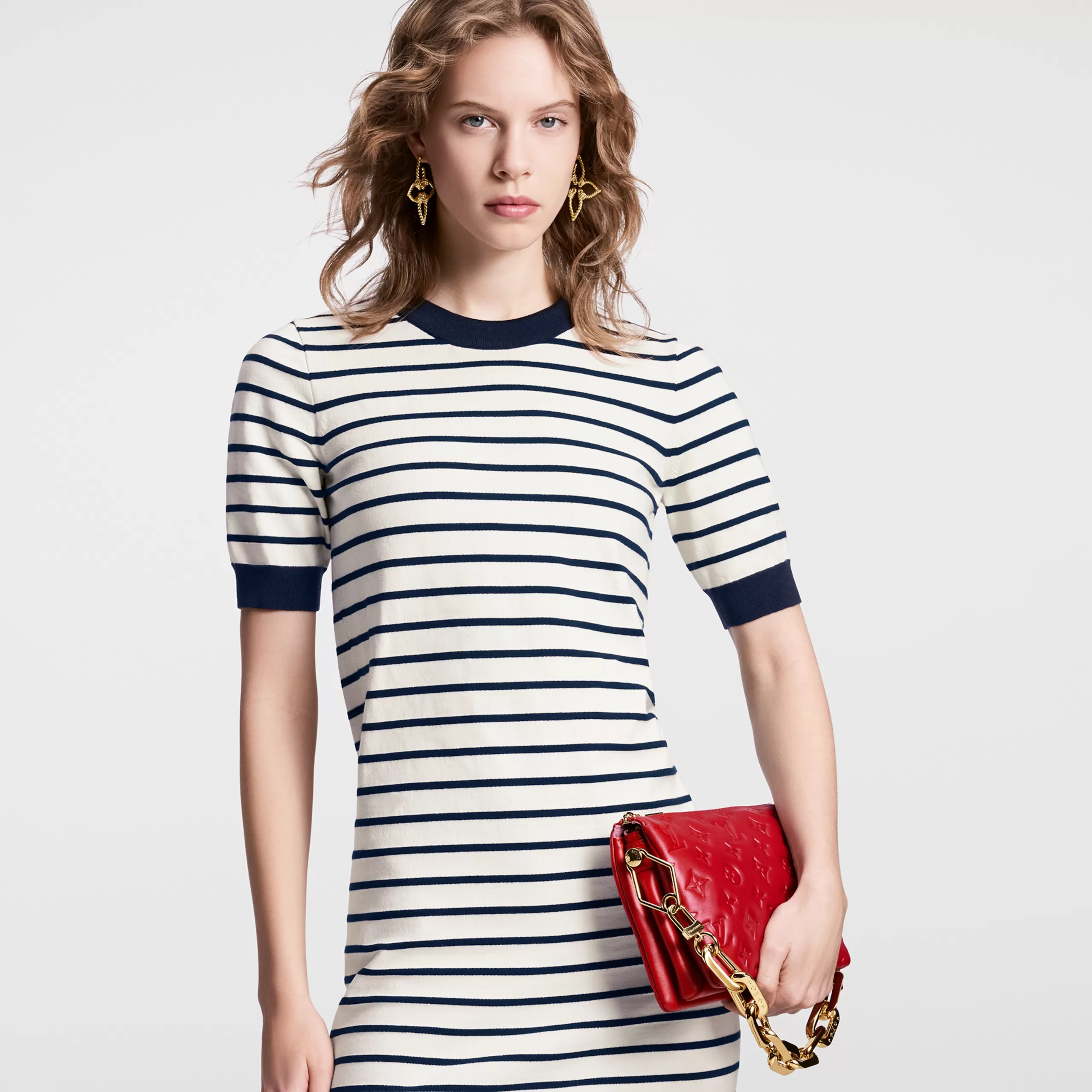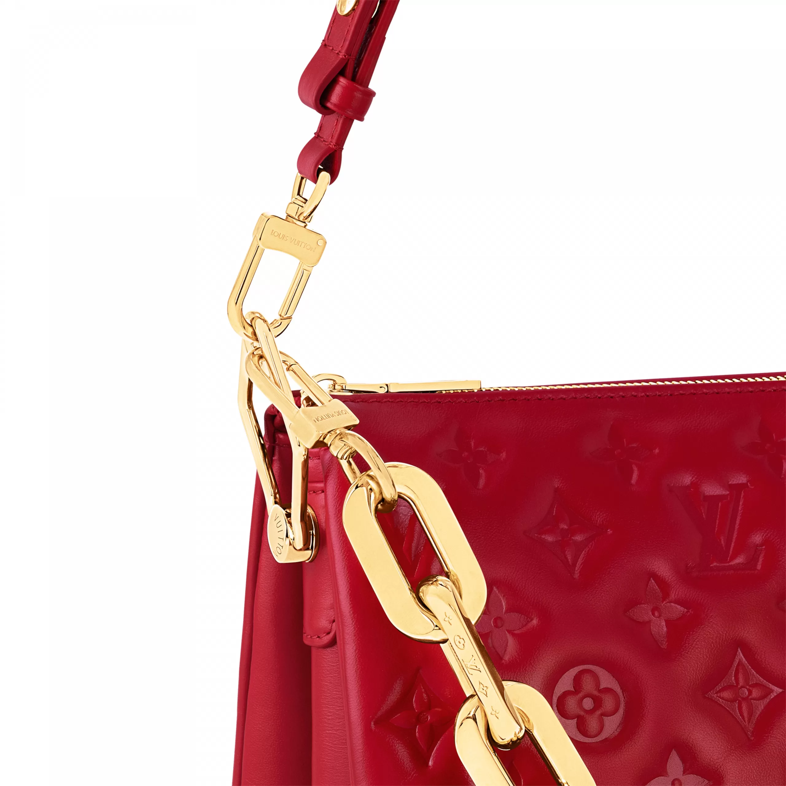 This Coussin BB handbag in padded lambskin with its chunky golden chain is part of the Nautical Collection. The embossed Monogram pattern is echoed by the tiny LVs and Monogram Flowers engraved on the chain’s links. The interior has two compartments separated by zipped pocket.