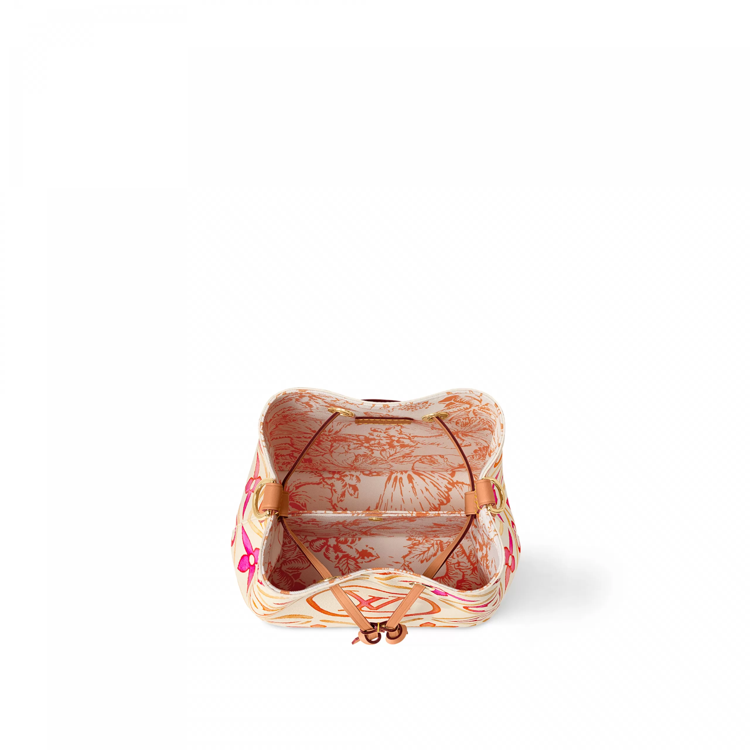 This adorable little bucket bag, the Néonoé BB in Monogram Tiles coated canvas, looks as good carried by hand as worn on the shoulder. The Monogram motif, treated in subtle nuances of pastel, features the LV Circle in the center of the bag. The printed textile lining pairs perfectly with the canvas pattern.