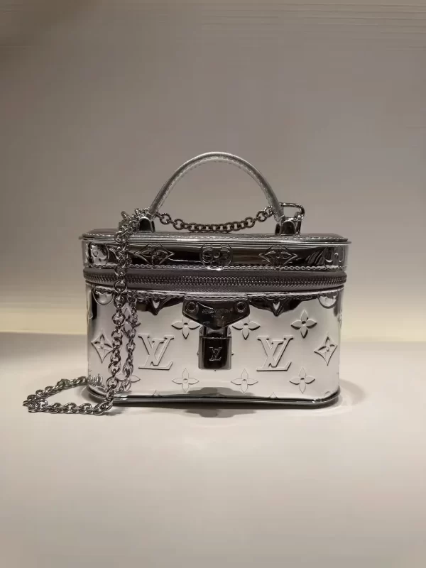 Inspired by traditional Louis Vuitton cases, this Vanity Chain Pouch embodies the House’s spirit of travel. Part of the LV Ski collection, it is crafted from Monogram Miroir canvas in a chic silver palette and features a matching signature LV-engraved padlock. The functional design includes a removable strap and chain, and is sized to fit essential items, such as a small coin purse and sunglasses.