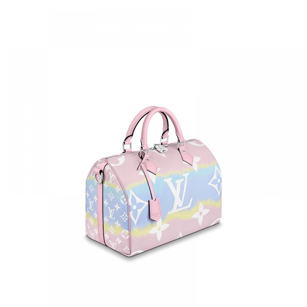 Tie-Dye Monogram canvas brings a beachy vibe to the Speedy Bandoulière 30, a classic Louis Vuitton city bag reimagined for the Louis Vuitton Escale collection. The rolled leather top handles and unique shape make this bag instantly recognizable, while the detachable shoulder strap offers comfortable carrying options. It comes with the iconic engraved padlock.
