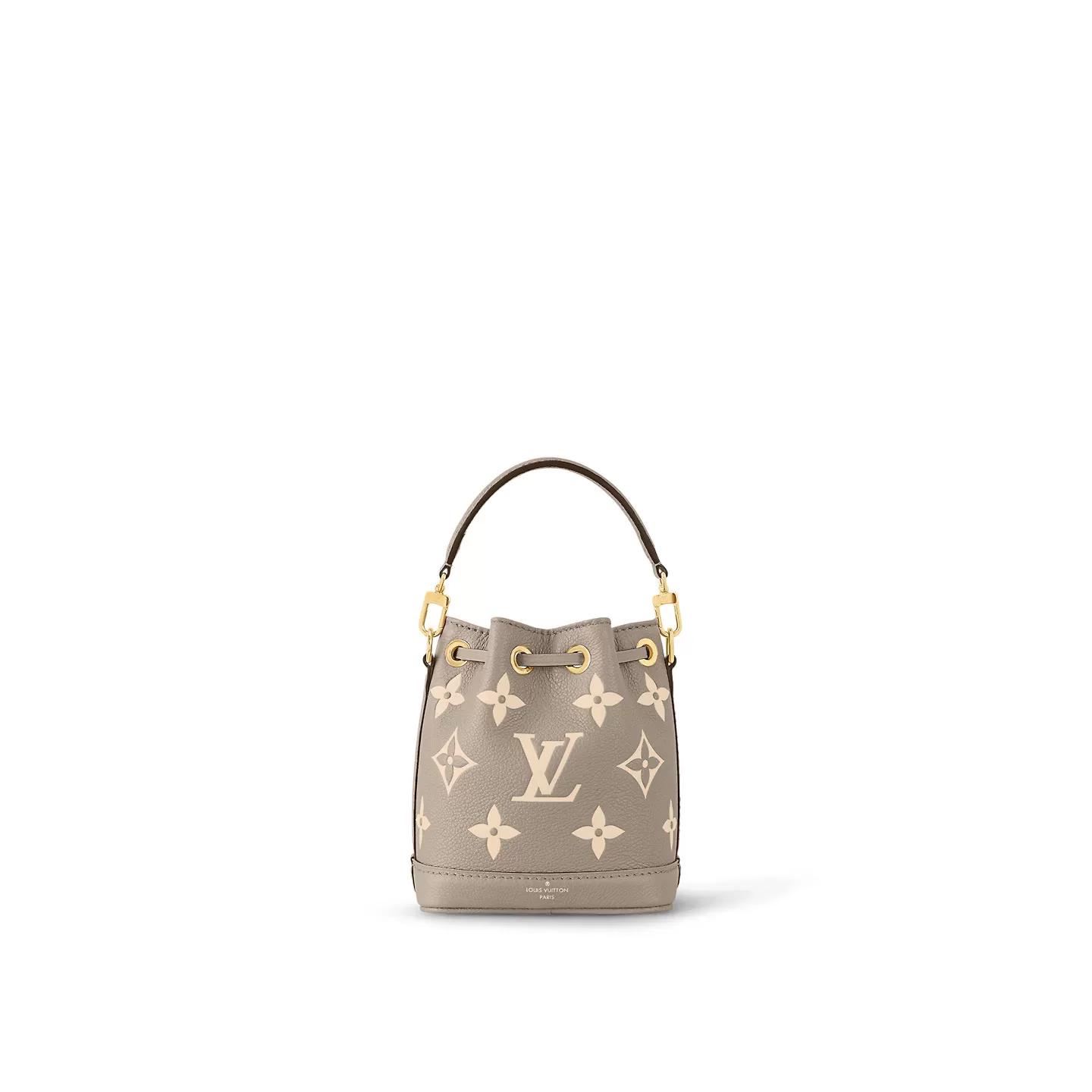 This bicolor version of the Nano Noé is crafted from supple Monogram Empreinte leather, embossed with the Monogram pattern. This miniature replica of the iconic Noé bag is a stylish way to carry everyday essentials. In addition to its practical drawstring closure, it features a removable handle and a removable, adjustable shoulder strap for different carry options.