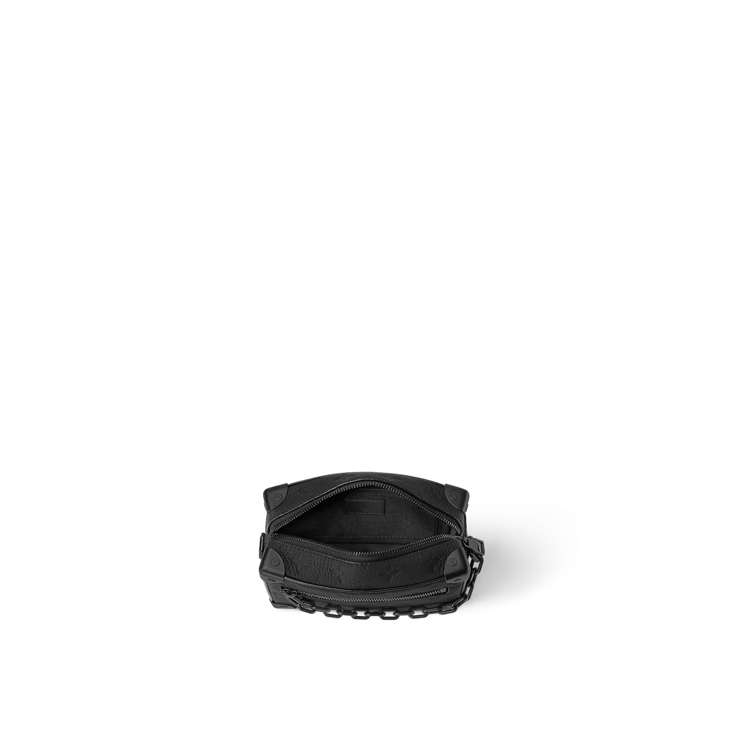 With its riveted corners and boxy shape, the Mini Soft Trunk bag in black Monogram-embossed Taurillon leather is a direct descendent of Louis Vuitton’s original trunks. The two matte-black chains, one connected to the zipper and the other serving as part of the shoulder strap, bring modernity to this small bag.