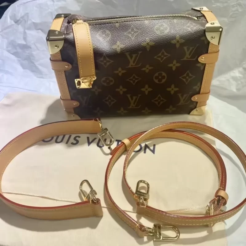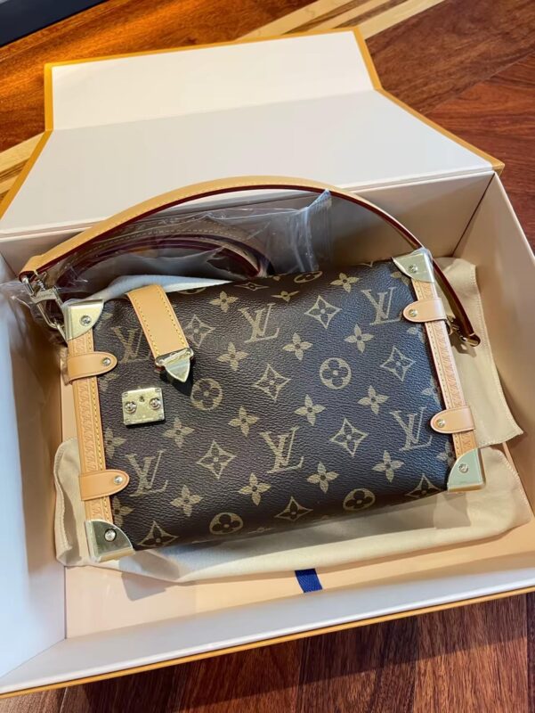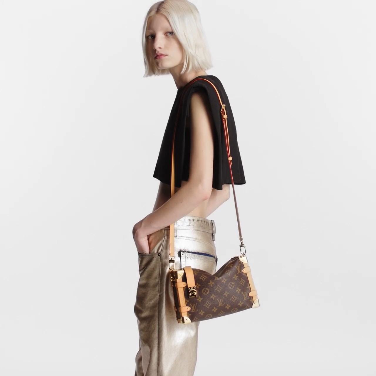 Returning to the House’s trunkmaking beginnings, Nicolas Ghesquière creates the Side Trunk MM handbag in Monogram canvas with leather trim. What strikes the eye is the singularity of the leather zip tab fitted with the iconic S-lock and the reinforced metallic corners. The wide top handle is removable as is the thin leather shoulder strap.